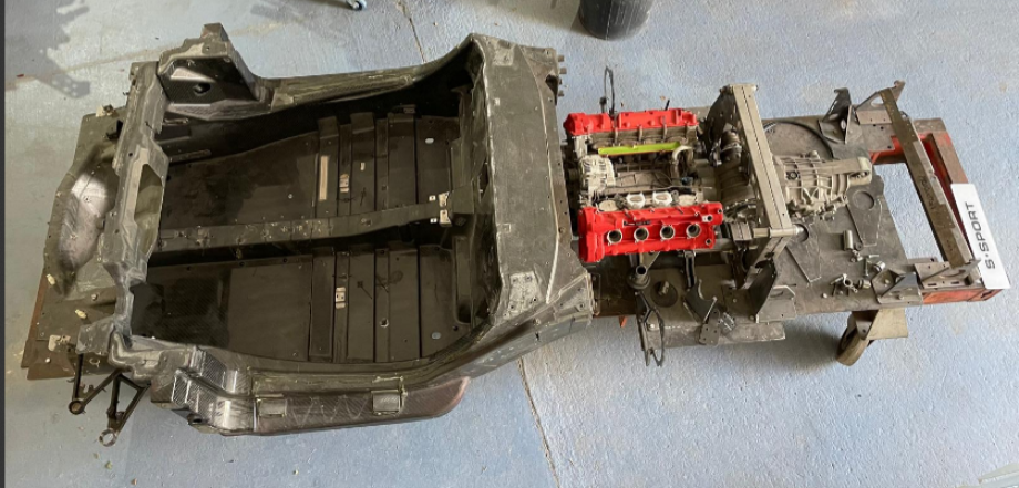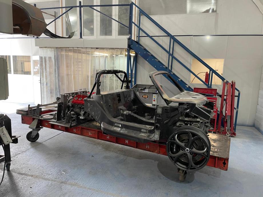 The car uses the Alfa Romeo 4C carbon fibre chassis with a new subframe to take the Alfa 8C V8 engine and our 6 speed manual gearbox. Suspension is upgrade at the front with our bespoke CNC machined aluminium uprights designed to take Alfa Giuia QV wheel bearings which allows us to fit Alfa 365mm front ventilated discs and 6 pot calipers with lightweight OZ wheels.
