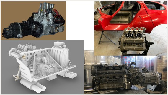 The Maserati 4.2l V8 F136 engine is closely related to the Alfa Romeo 8C V8 engine, and is available with a dry sump as standard. There are used engines available at good prices and we have developed a throttle body kit with 8 vertical throttle trumpets and a standalone ECU to allow the engines to be used in the Stradale. Scans of the engine were used to develop designs for the engine ancillaries.