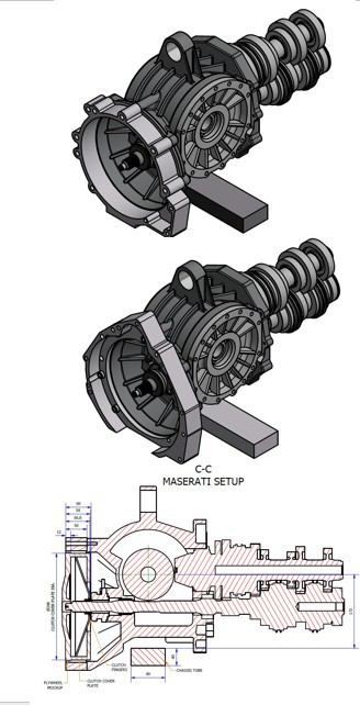 It utilises a separate short bellhousing to allow the gearbox to be used with either the Montreal or Maserati engines. We have also developed a flywheel and clutch package for the two engines with a single plate clutch for the Montreal and twin plate clutch for the Maserati engine.